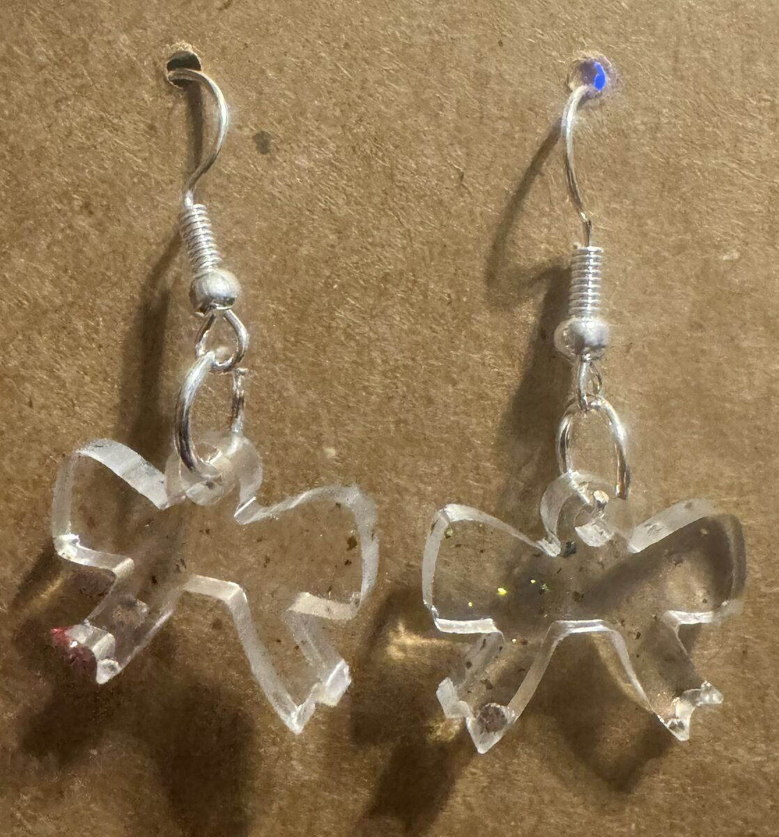 Elevate your look with these gracefully simple, transparent bow earrings. Crafted from crystal-clear resin and lightly dusted with subtle, shimmering glitter (or flecks), they capture light beautifully without overwhelming your style. Suspended from sterling silver-plated French hooks, these delicate drops add a touch of feminine charm and modern elegance to any outfit.